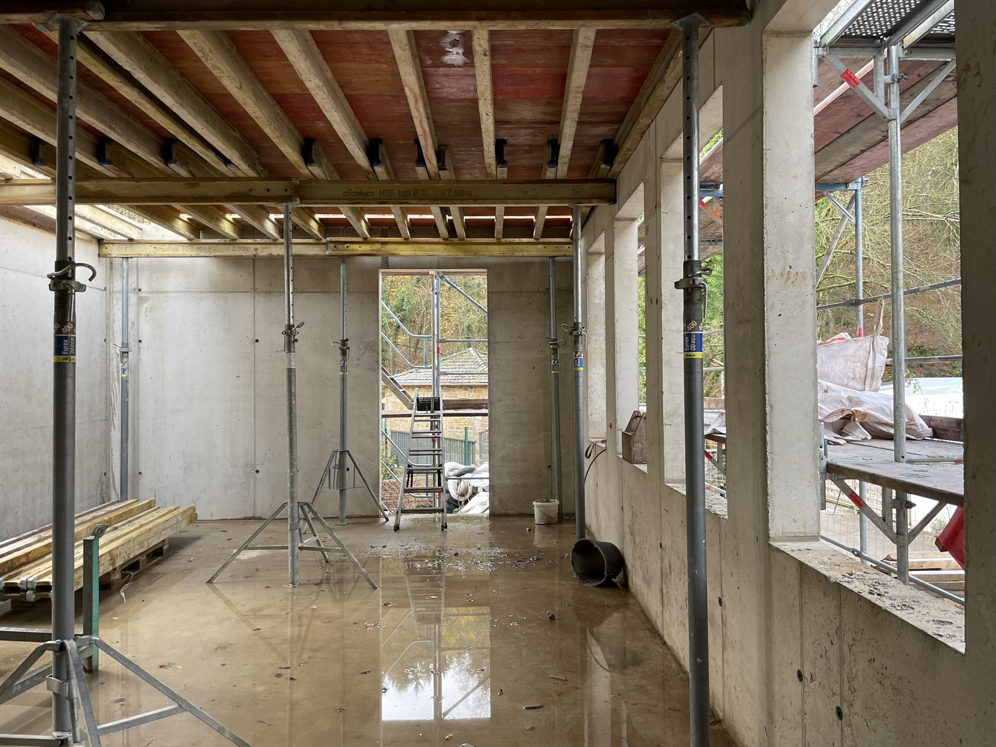 Der Wiederaufbau und das neue Erweiterungsgebäude erfolgt hochwasserresilient und nach dem Prinzip des Zirkulären Bauens. Durch ein Grün- und Retentionsdach, eine Beheizung per Wärmepumpe, Eigenstromgewinnung und einen erhöhten Dämmstandard werden hohe Ziele an die Nachhaltigkeit gelegt.